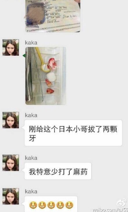 ある歯科医がSNS上で「今、日本人男性の歯を2本抜いた。わざと麻酔を少なく打った」と書き込んだとする画像がネット上に出回った。画像には、日本人男性のパスポート写真まで掲載されていた。ネット上ではたちまち大きな議論を呼び、多くのネットユーザーから「ニセ愛国だ」「道徳がない」との非難が浴びせられた。
